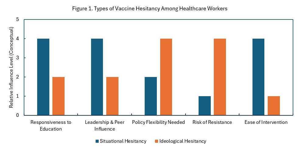 Together, these findings underscore the importance of tailoring vaccination policies to the type of hesitancy encountered. Figure 1 presents a conceptual comparison of situational and ideological hesitancy, highlighting differences in responsiveness to education, leadership influence, policy flexibility needs, and intervention complexity. Policies that account for these distinctions are more likely to achieve sustained compliance than enforcement-only approaches.