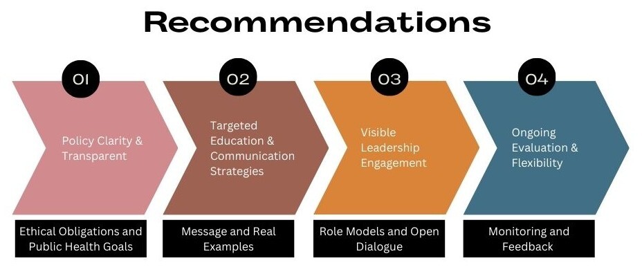 An integrated approach combines clear vaccination requirements with targeted education, leadership engagement, and accessible vaccination options. By reducing practical barriers while reinforcing professional and ethical expectations, this model addresses both situational and ideological hesitancy (Shen et al., 2020).